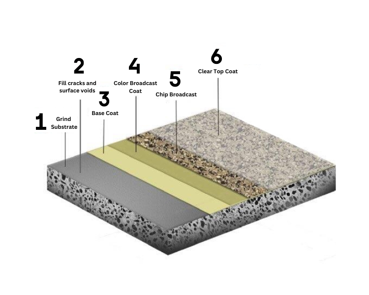 TotalGarageUSA's Polyaspartic Coating Systems are meticulously designed to provide a comprehensive flooring solution. The process includes grinding the floor, addressing cracks with repair and seal techniques, applying a first coat penetrating 1/16" to 1/8" for mechanical bond, adding a base color coat, incorporating a ¼ inch chip broadcast for texture, and finishing with a top clear coat using Polyaspartic for enhanced durability. All coats are Polyaspartic.
