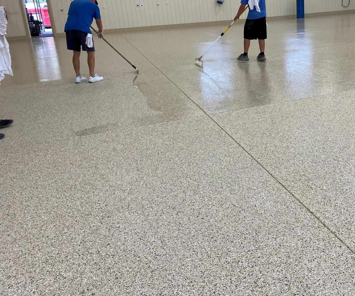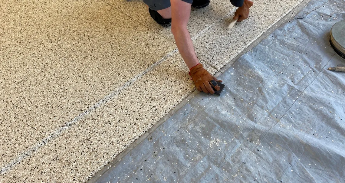 Installers lay down a polyaspartic clear base coat and occasionally add color pigment to help enhance color. that acts as a primer for the flooring.